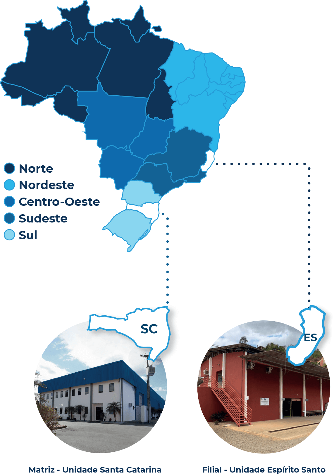Contamos com duas unidades produtivas, sendo que nossa unidade matriz está localizada na cidade de Jaraguá do Sul - SC, um dos maiores polos industriais do sul do Brasil, além de contarmos com uma unidade produtiva no estado do Espírito Santo.